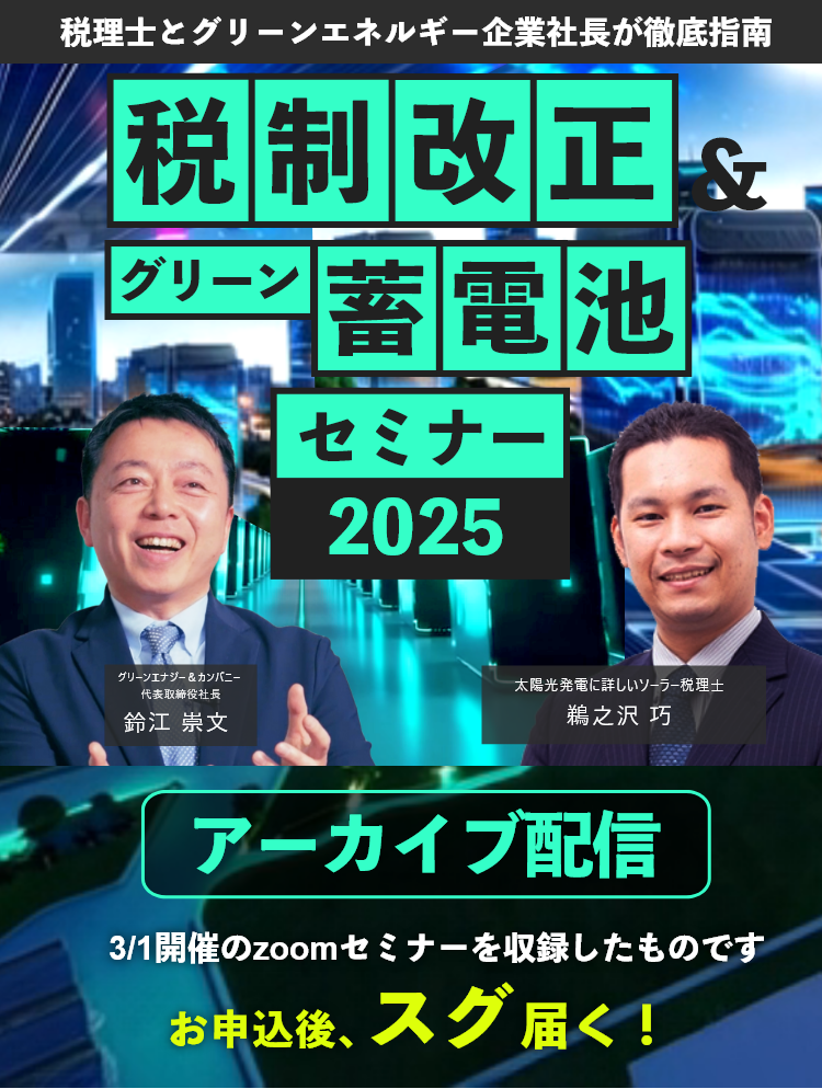 税制改正&グリーン蓄電池セミナー2025 seminar ホーム 税制改正&グリーン蓄電池セミナー2025 お申込フォーム お名前* 姓 名 メールアドレス* 参加方法*後日配信希望※申込後すぐ自動返信メールにてお送りいたします。視聴期限:申込後2週間 ※3/1当日Zoom開催は終了致しました。個人情報の取り扱いについて* 個人情報の取り扱いに同意する お問い合わせに際してご入力いただきました、お名前、メールアドレスなどの個人情報の取り扱いについて、弊社のプライバシーポリシーにご同意いただいた上で、送信ください。 Δ